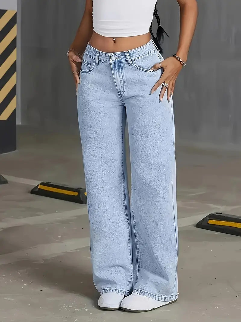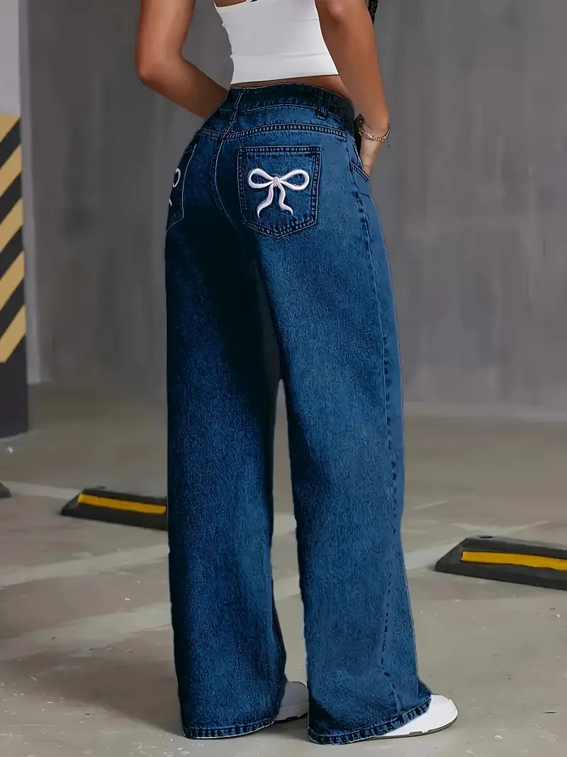 A playful pair of wide-leg jeans with cute bow details on the pockets, adding a touch of charm to a relaxed silhouette.