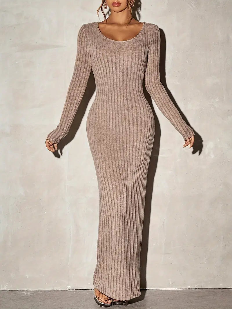 A sleek, long bodycon dress that combines form-fitting style with winter warmth for a flattering silhouette.