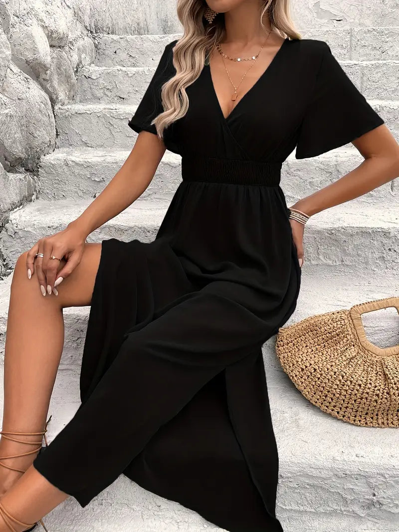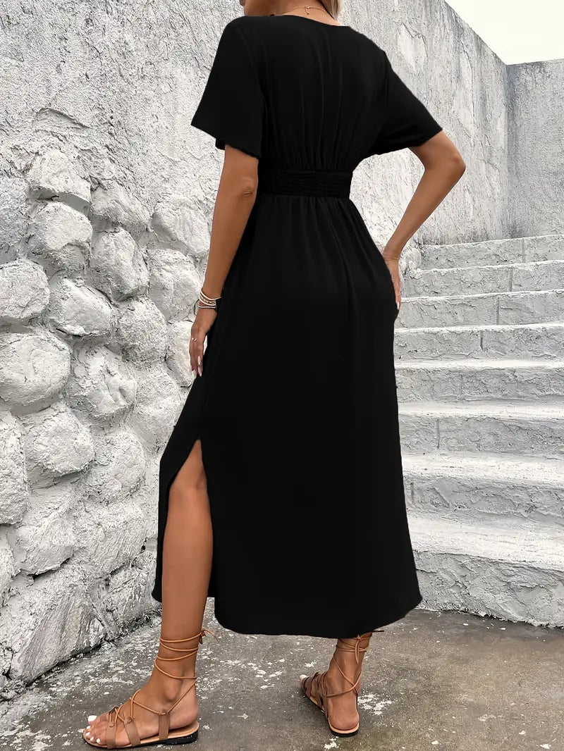 A feminine and flattering summer dress featuring a shirred, cinched waist that accentuates the silhouette. Perfect for casual days, its comfortable fit and effortless style make it a versatile addition to any warm-weather wardrobe.