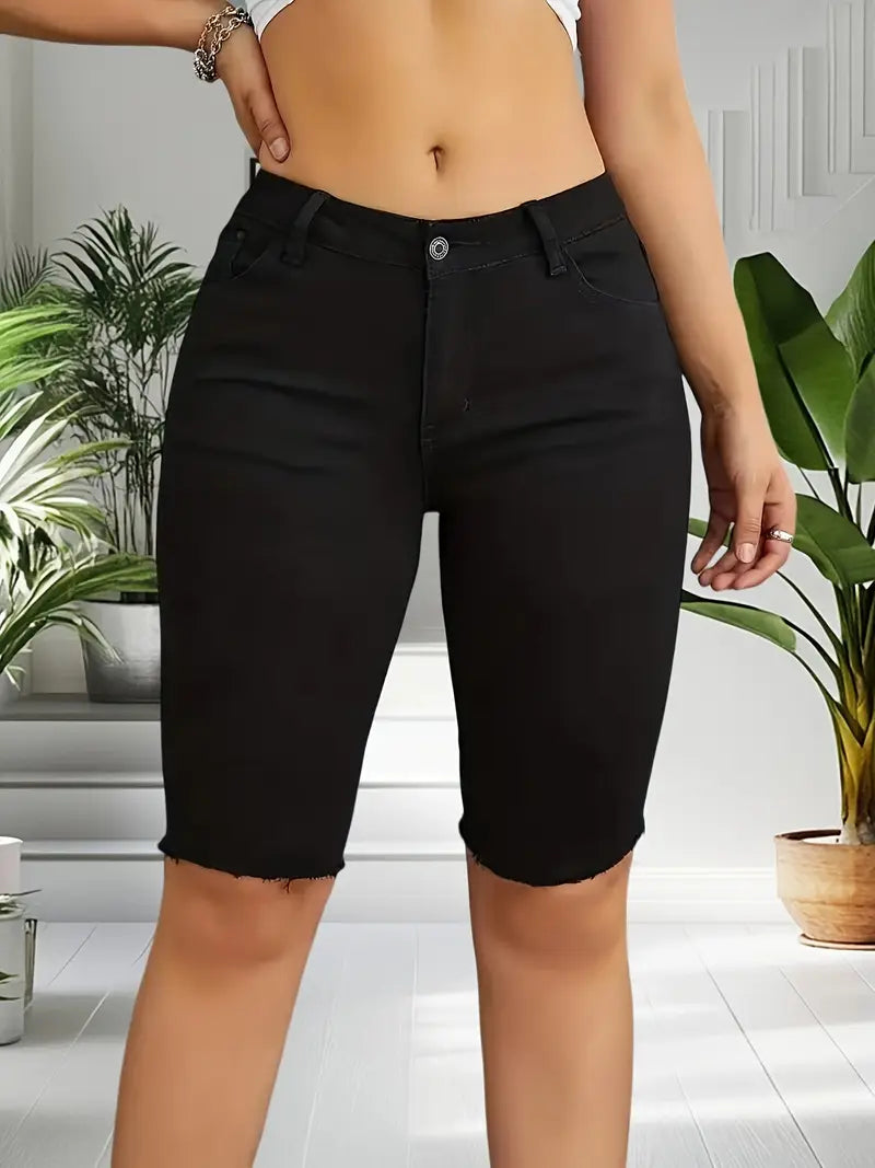 A versatile black knee-length jean short, perfect for effortless style and all-day comfort.