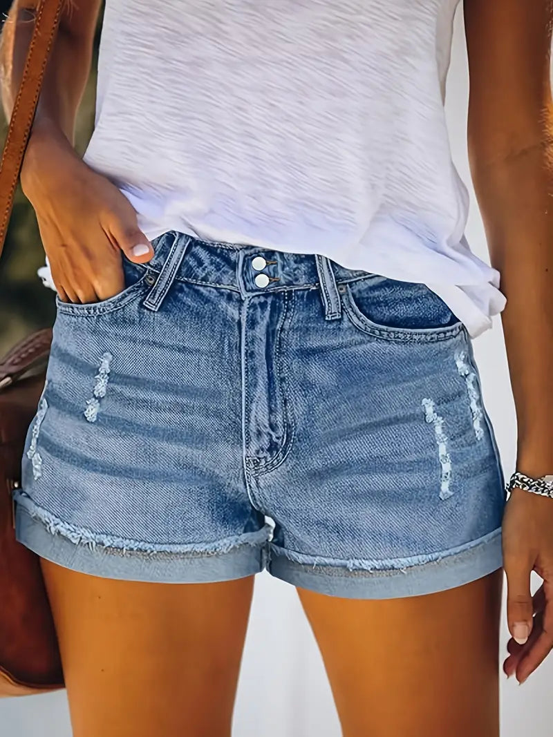 A classic cuffed mini jean short, offering a versatile and effortless style for all-day wear.