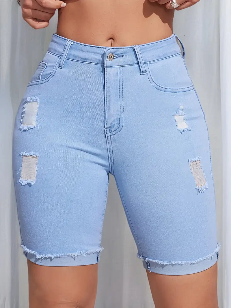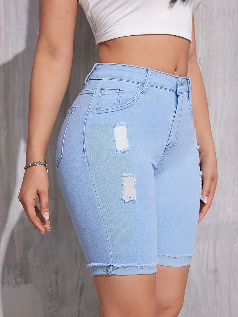 A bold, ripped knee-length jean short that adds an edgy touch to casual, laid-back style.